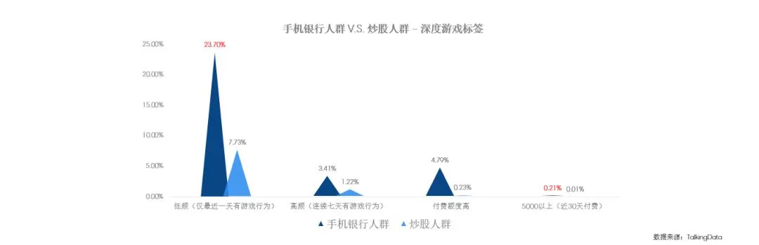 通过深度的游戏标签属性,我们可以发现,理财偏好为手机银行端且没有炒股相关APP的人群的更爱玩游戏,其中每天会有至少一次游戏行为的用户超过20%;而相比之下此类用户在炒股人群中仅占7.73%。高频游戏人群在手机银行人群中的比率为炒股人群中的近三倍。