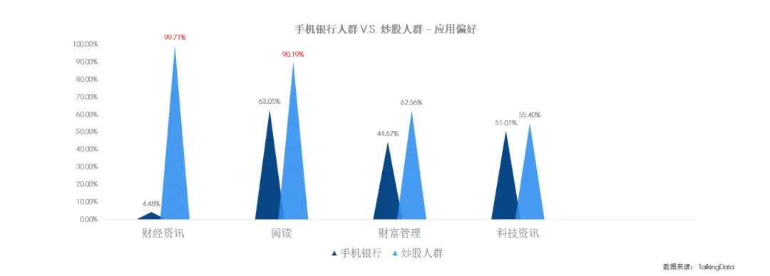 通过分析炒股人群以及手机银行理财人群可以发现,炒股人群中几乎所有人都会关注财经资讯,而在银行理财人群中则只有不到5%的占比。但是两种人群都爱阅读科技资讯类读物。此外,炒股人群更多关注财富管理产品。券商与其在大流量平台买流量,不如在财经资讯类渠道投放广告,说不定会有惊喜。科技资讯和阅读可以作为一种服务,为银行客群提供更好用户体验。