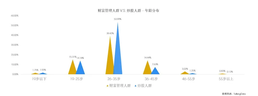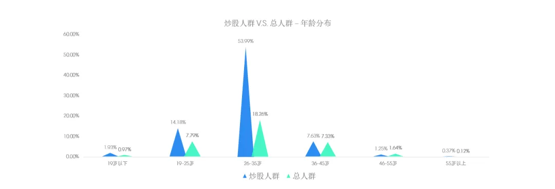 炒股人群呈现年轻化,其中19-35岁的人群占比超过68%,相比在总人群中26%的占比超过一半还多。