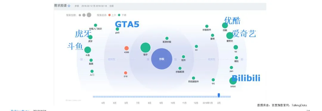 通过在2018年2月的百度指数中搜索炒股人群以及其相关度,我们发现,搜索“炒股”的人群可能是爱奇艺、优酷的用户。喜欢玩GTA5(侠盗猎车5),常逛bilibili,也经常会去斗鱼或者虎牙观看直播。