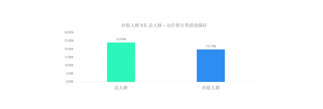 在游戏偏好中我们发现,炒股人群中喜爱动作射击类游戏(亦如GTA5)的人群占比远远不及总人群。为什么呢?