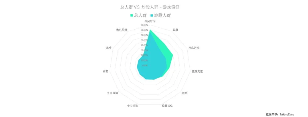 相较于总人群,炒股人群的游戏属性较弱,比较偏爱扑克棋牌、经营、策略类游戏。与投资、经营有关的游戏更受炒股人群的喜爱。比如天天德州。