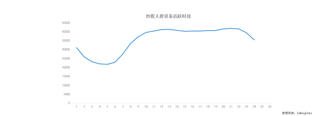 炒股人群设备活跃时段是比较典型的上班族活跃曲线,白天的活跃时段波段比较平稳,在下午的一点到五点会有比较小幅度的缩减。