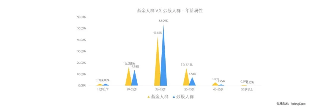 我们发现基金人群在19-25岁、36-55岁的维度占比更高。可以总结出,80后更偏爱个人决策炒股,90后、70后更偏向将资金交给基金。