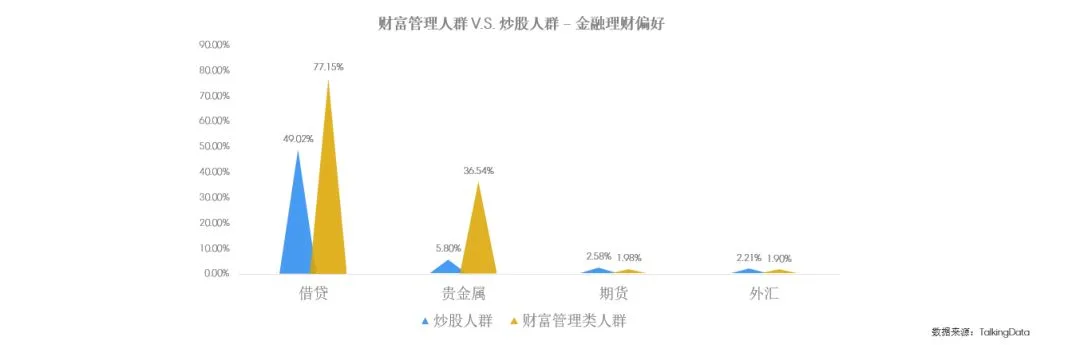总体分析,财富管理人群与炒股人群的金融理财偏好相当,但是数据分析发现偏向财富管理的人群有更高的借贷属性,甚至在贵金属投资中的占比是炒股人群的6-7倍。