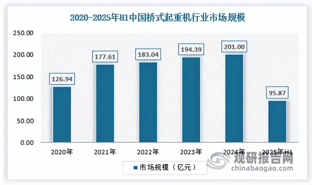 桥式起重机作为现代工业物料搬运的核心设备,在中国制造业和基础设施建设中扮演着关键角色,其市场规模持续受下游需求驱动而稳步增长。2025年上半年桥式起重机行业市场规模约为95.87亿元,具体如下: