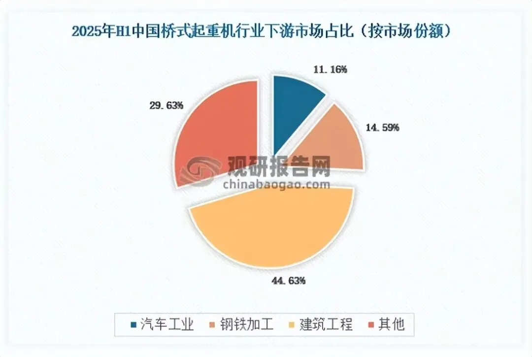 当前我国的经济快速发展,对于各种大机械设备的使用是十分的多的。桥式起重机机械就是其中之一。桥式起重机主要应用于工厂建设、钢铁加工、企业工业以及船舶工业等领域,2025年上半年我国桥式起重机下游各领域销售情况,具体如下: