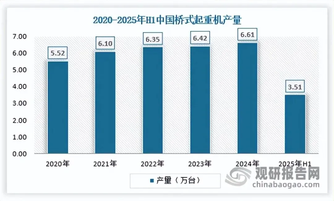 在桥式起重机行业国产替代的大背景下,国内领先企业凭借卓越的技术实力、产品质量。在此背景下,卫华集团有限公司、河南省矿山桥式起重机有限公司以及河南豫飞重工集团有限公司在国内桥式起重机领域其市场占有率连续多年稳居行业前列。2025年上半年我国桥式起重机产量约为3.51万台,具体如下:
