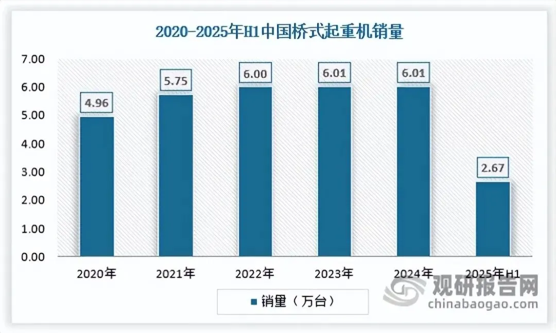 当前我国的经济快速发展,对于各种大机械设备的使用是十分的多的。桥式起重机机械就是其中之一。其中,桥式起重机市场增长动力主要来自港口自动化、新能源基建等领域对高效物料搬运设备的需求增加。2025年上半年我国桥式起重机销量约为2.67万台,具体如下:
