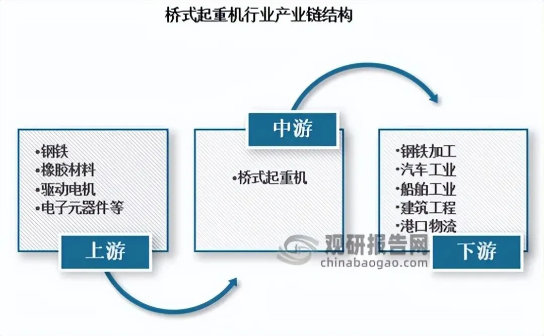 桥式起重机行业产业链上游主要为原材料供应商和零部件制造商。其中,原材料主要包括钢铁材料、其他金属材料、橡塑材料等;核心零部件包括驱动电机、电气控制系统等。产业链中游为桥式起重机的生产制造。产业链下游为应用领域,包括钢铁加工、汽车工业、船舶工业、建筑工程、港口物流等。