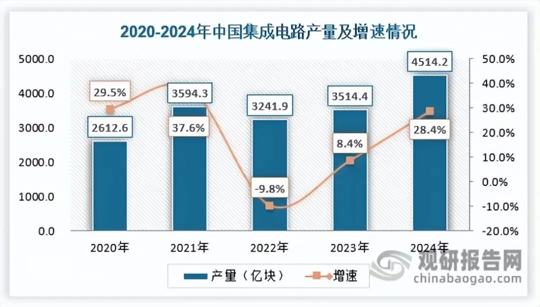 随着人工智能对算力芯片、智能制造对工业用芯片、智能网联企业对汽车用芯片等需求的扩张,中国集成电路产业总体规模将进一步增长。2024年我国集成电路产量4514.2亿块,同比增长28.4%,具体如下: