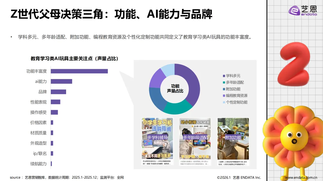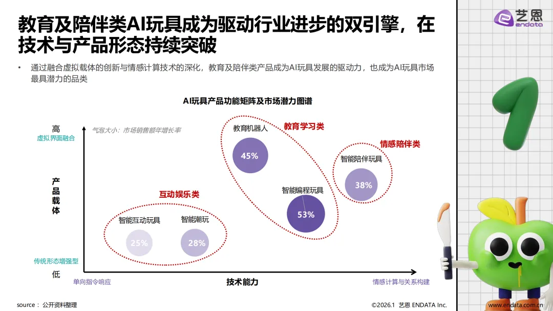 AI 玩具是嵌入人工智能技术、具备交互与场景感知能力的创新产品,核心技术涵盖大模型、自然语言处理、情感计算等。全球市场增长迅猛,2030 年规模将达 351 亿美元,年复合增长率超 50%;中国市场增速更突出,预计 2030 年达 38.6 亿美元,年复合增长率 75%。市场格局呈现传统玩具制造商、IP 运营公司与科技巨头三分天下的态势,2025 年 Haivivi 等 IP 方与优必选等科技公司增长显著,传统厂商凭借供应链优势稳居前列。品类上,教育学习类占比最高,教育机器人与智能编程玩具为核心,情感陪伴类与互动娱乐类高速成长。价格带覆盖 100 元至 3 万元以上,不同价位对应基础互动、多功能及深度交互等差异化需求。