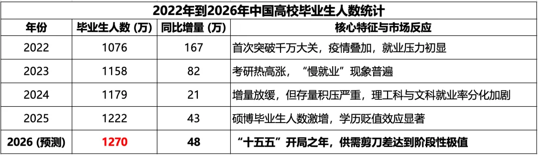 供给过剩: 通用型文科、传统金融、土木建筑以及基础IT开发类毕业生面临极其严峻的就业形势,青年失业率仍是需要重点关注的结构性问题。 供给短缺: 具备跨学科能力的复合型人才(如AI+生物、AI+法律)、高级蓝领技工(精密加工、机器人运维)以及具备实战经验的出海管理人才极其匮乏。