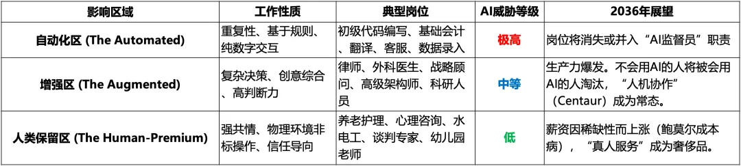 顺势而为:需要认清当前的周期节点,顺势而为不要试图对抗康波周期的冬天或库兹涅茨周期的下行周期。已经处于深度下行期的行业,可以立刻寻找转向趋势行业转型的机会。已经处于深度内卷的市场,可以立刻寻找转向更大容量市场的机会。 拥抱物理世界:随着meta元宇宙团队的裁撤基本可以宣告纯数字世界(Metaverse)的泡沫已破,虚拟世界将重新回归价值重估,同时未来5-10年应属于“物理世界的数字化”。去实体制造覆盖的工厂、电网、海外市场,那里有AI难以替代的复杂场景。 保持流动性:无论是地理上的流动性(愿意出海),还是技能上的流动性(愿意终身学习)。在2026-2035年,适应力(愿意与时俱进)是最高等级的货币。 聚焦长板:未来的职业竞争将更加泛化和边缘化,比的不是学历几何,而是谁能提出更好问题,训练AI拿出好方案的真功夫。与其在职业发展的过程中“内卷”人情世故,不如主动打造自己的“职业生存”的差异化能力长板,只要职业能力足够出众,能为企业带来价值,其他的一切都是浮云。 保持开放心态:永远保持学习和进化的心态。不要幻想一劳永逸地找个“铁饭碗”就可以安稳过一生。在这个时代,唯一不变的就是变化本身。也许你第一份工作并不完美,甚至与专业无关,但不要紧,把它看作锻炼自己的一段旅程。在职场初期多尝试、多见识,不断自我迭代。如果发现行业前景不好,也不要害怕转换赛道,及时调整比一条路走到黑强。规划可以分阶段走:短期先解决就业生存问题;中期积累经验、人脉,找准兴趣专攻领域;长期再谋求事业的突破与成就。任何时候都不要停止思考:“我的话语权是什么?我的主动权在自己手里吗?” 这个时代不会停下来哪怕一秒去等待那些不愿意进化的人,只有想清楚自己人生需要拥有什么,在未来的道路上的选择才不会迷茫,才不会走错自己想要的未来之路。