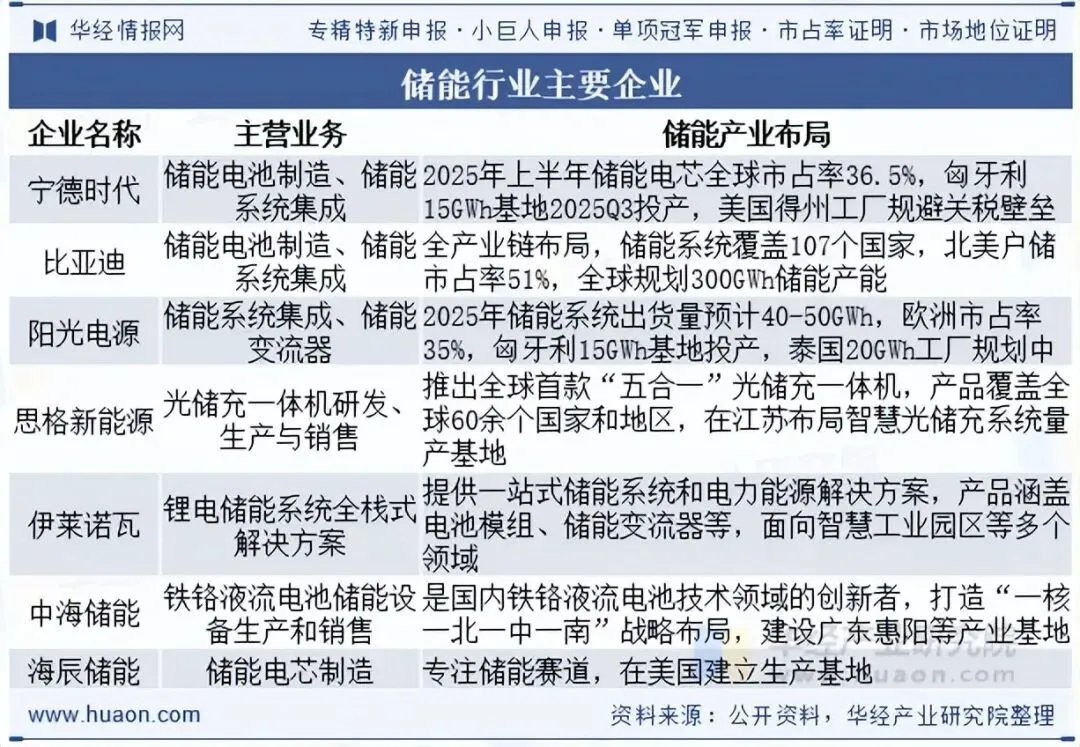 国内储能行业竞争格局中,宁德时代作为储能电池全球龙头,2025年上半年市占率达36.5%。阳光电源在储能系统集成领域表现突出,欧洲市占率35%。比亚迪凭借全产业链布局,在海外市场尤其是北美户储领域占据重要地位。此外,亿纬锂能、海博思创等企业也在各自细分领域具有一定竞争力,行业整体呈现出头部集中、多元竞争的态势。