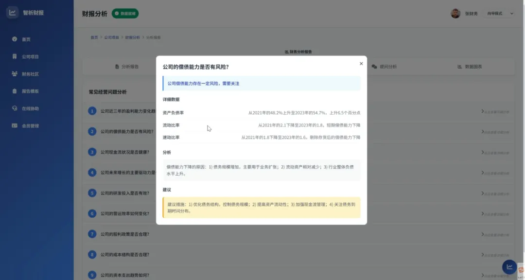 • 降低运营成本:减少对外部审计或财务分析服务的依赖,尤其适合中小企业常态化使用; • 提升数据化决策文化:降低财报使用门槛,推动团队养成“用数据说话”的习惯; • 增强风险应对能力:提前识别财务风险,如现金流压力、负债过高、盈利能力下滑等。