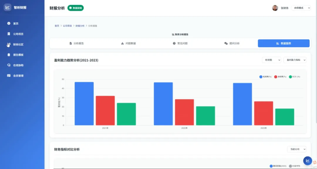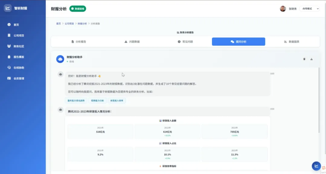 • 快速掌握财务健康度:无需专业背景,也能通过可视化报告和简明解读理解公司财务状况; • 及时发现经营异常:高亮提示数据异常(如利润率骤降、应收账款周转放缓),帮助事前风控; • 支持战略决策:基于历史数据和行业对比,提供数据驱动的可行性建议,辅助业务调整与资源分配。