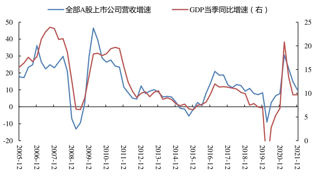 GDP 增长代表整个经济体规模的不断变大,由于经济体由一个个微观主体构成,因此整体经济规模变大背后反映的是微观企业主体的发展壮大。从 GDP 核算的角度来看,企业生产活动的最终成果是收入法 GDP 的重要组成部分,企业营业收入增长率与经济总规模的变化理应高度相关。从历史数据来看,全部 A 股上市公司的营收增速与 GDP 增速的走势具有较为明显的一致性(图1),因此营收增速可以作为GDP 增长的重要微观表征 。