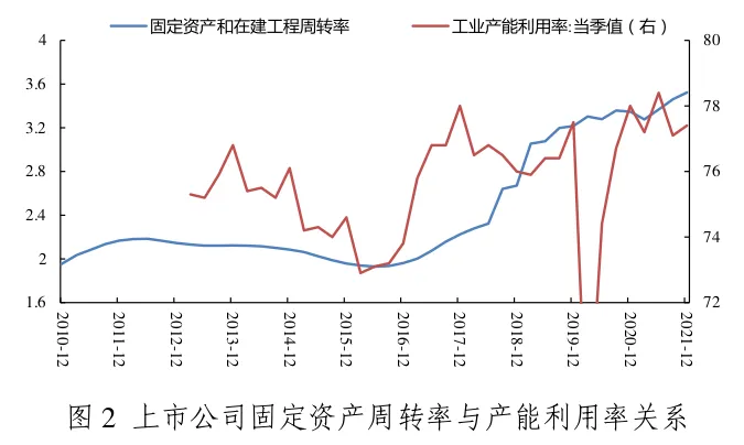 经济周期是宏观研究的重要对象,通过了解经济体在周期所处的阶段,可以对下一阶段经济活动的扩张或收缩做出一定预测判断。在不同经济周期中,比较重要的一般为产能和库存周期,前者表示企业(特别是制造业企业)的资本开支的周期波动,后者则用以描述企业库存商品的变动规律。从历史数据看,上市公司的固定资产和在建工程周转率与国家统计局公布的工业产能利用率基本一致(图 2),同时产能利用率又是制造业固定资产投资同比增速的领先指标,可以作为企业产能投资周期开启的重要信号,因此我们用“上市5公司固定资产和在建工程周转率”作为宏观产能周期的替代指标。数据分析表明,2022 年上半年全部 A 股上市公司的固定资产和在建工程周转率为 1.64,低于 2021 年上半年的1.67,也低于 2019 年上半年的 1.70,但仍处于近十年较高位臵,反映出当前产能周期或处于高位,但有下行压力。