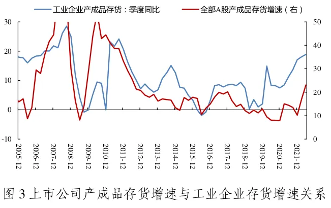 上市公司的财务数据还可以对库存周期进行微观佐证。从历史数据看,A 股上市公司产成品存货同比增速与国家统计局公布的工业企业产成品存货增速变动趋势基本保持一致(图 3),因此我们用“上市公司产成品存货同比增速”作为判断库存周期的微观指标。数据分析表明,2022 年上半年全部 A 股上市公司产成品存货同比增速为 23.06%,高于 2021年的 14.65%,也高于疫情前 2019 年的 6.83%,处于近十年的高位。从经济分析的角度看,库存高增长有两种原因,一是需求旺盛导致企业主动补库存,二是需求不足导致企业被6动累库存,从当前宏观经济形势看我们认为后者可能性更大,后续企业可能面临较大的去库存压力。