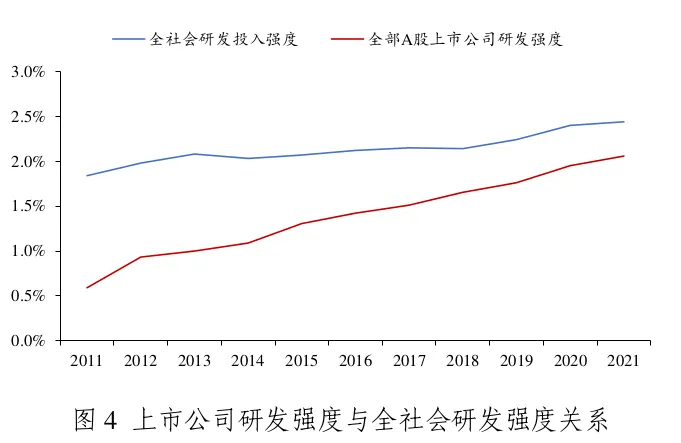 中国经济从高速发展进入高质量发展阶段,意味着以往推动经济发展的模式、动力和方法路径都将发生变化,其中最重要的特点是经济增长动力由要素驱动转向创新驱动。从宏观经济层面看,创新驱动力的基础在于强有力的研发投入。截止 2021 年,我国全社会研发经费投入已经连续 6 年保持两位数增长,从历史数据来看,上市公司研发投入强度(研发支出/营业收入)与全社会研发投入强度(研发投入/GDP)之间有显著的相关关系(图 4),且更新频率更高,因此可以作为微观层面研发能力的重要指征。此外,除研发投入外上市公司财务报表通常还会披露研发人员数量、研发人员薪酬和专利数量等研发类指标,提供的信息更为丰富,因此能够更加全面地反映经济创新活力和潜力。