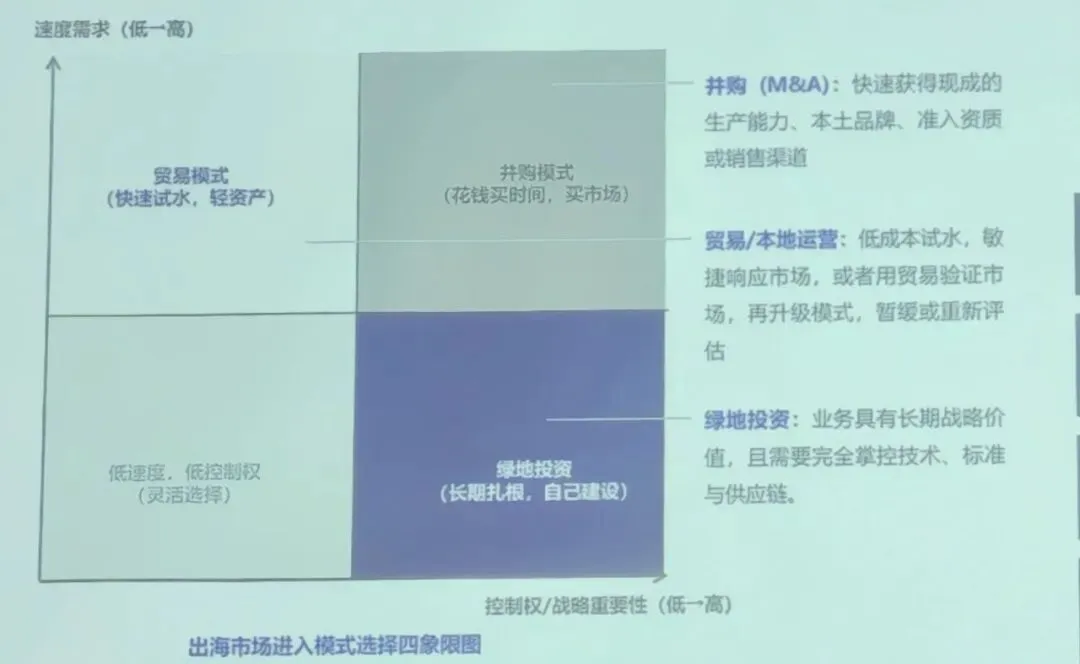 高速度、低控制权:选择贸易/本地化运营模式。 高速度、高控制权:选择并购模式。 低速度、低控制权:灵活选择过渡模式。 低速度、高控制权:选择绿地投资模式。