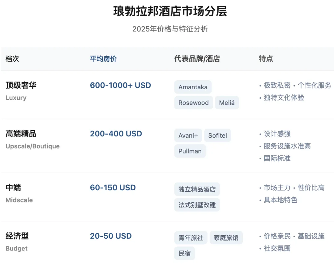 琅勃拉邦的酒店市场呈现出多元化的竞争格局,从奢华度假村到经济型民宿,各具特色。