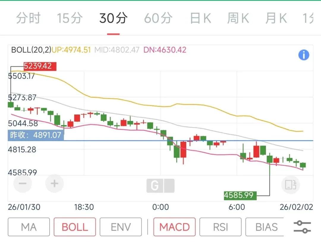 早盘国际黄金低开100多美金于4783美元/盎司,随后快速震荡反弹大几十美金至4885美元/盎司附近,然后再度下跌,不到两个小时的时间盘中再度下跌整整300美金至4584美元/盎司附近,而该点位也是目前的低点,之后再次反弹,目前又反弹一百大几十美金至4750上方。