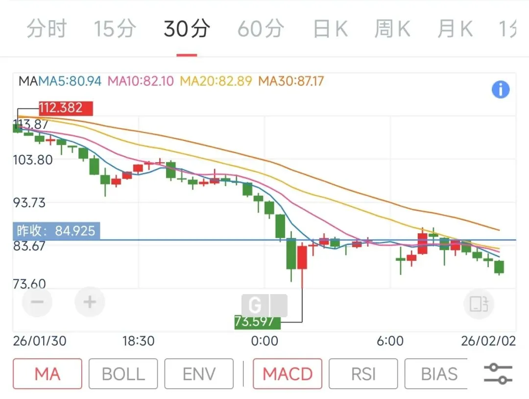 截止目前北京时间11点50分左右,黄金再次下破4700美元/盎司,而白银在再次下触77美元/盎司附近后小幅反弹至80美元/盎司下方波动,而真正大波动的行情大概会出现在欧美盘,接下来行情会如何波动,还真有点让人期待!