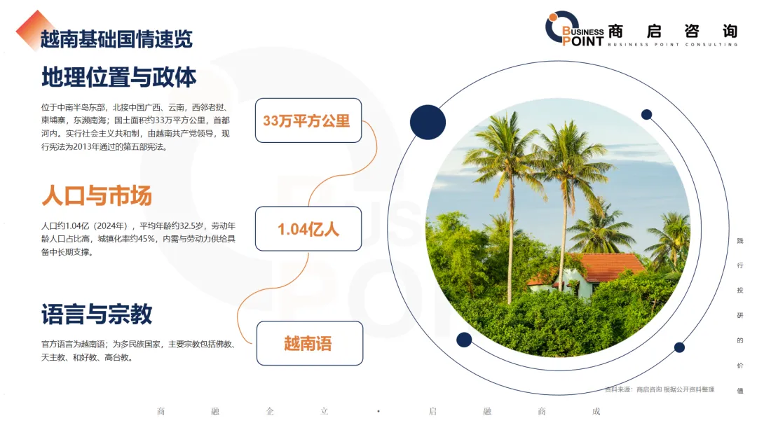 人口约1.04亿(2024年),平均年龄约32.5岁,劳动年龄人口占比高,城镇化率约45%,内需与劳动力供给具备中长期支撑。