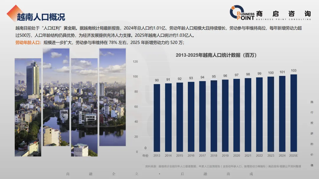 越南目前处于“人口红利”黄金期。据越南统计局最新报告,2024年总人口约1.01亿,劳动年龄人口规模大且持续增长,劳动参与率维持高位,每年新增劳动力超过500万,人口年龄结构仍具优势,为经济发展提供充沛人力支撑。2025年越南人口统计约1.03亿人。