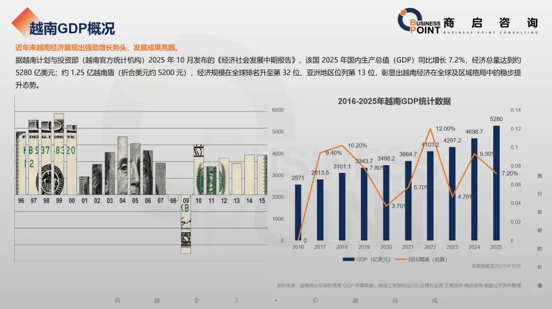 据越南计划与投资部(越南官方统计机构)2025 年 10 月发布的《经济社会发展中期报告》,该国 2025 年国内生产总值(GDP)同比增长 7.2%,经济总量达到约 5280 亿美元;约 1.25 亿越南盾(折合美元约 5200 元),经济规模在全球排名升至第 32 位、亚洲地区位列第 13 位,彰显出越南经济在全球及区域格局中的稳步提升态势。