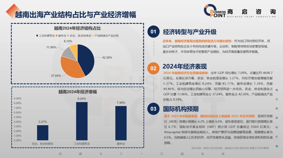 2024 年越南经济交出亮眼成绩单:全年 GDP 同比增长 7.09%,总量达约 4696.7 亿美元。从增长动力看,农业、林业和渔业增长 3.27%,对经济增加值增幅贡献 5.37%;工业和建筑业增长 8.24%,贡献 45.17%;服务业增长 7.38%,贡献 49.46%,成为拉动增长的核心引擎。经济结构进一步优化,农业、林业和渔业占 GDP 比重 11.86%,工业和建筑业占 37.64%,服务业占 42.36%,产品税减去产品补贴占 8.14%。国际机构预期基于 2024 年的稳健表现,国际机构纷纷上调越南 2025 年经济预期:亚洲开发银行(ADB)将增长预测从 6.2% 上调至 6.6%,居东南亚首位;渣打银行预测增长率达 6.7%;国际货币基金组织(IMF)预计其 GDP 总量将达 5060 亿美元;Vinacapital 则依托基础设施投入、房地产复苏与消费回暖等因素,预测增长率为 6.5%。当前越南人口红利仍存,经济发展势头迅猛,持续获得全球投资机构的乐观预期。