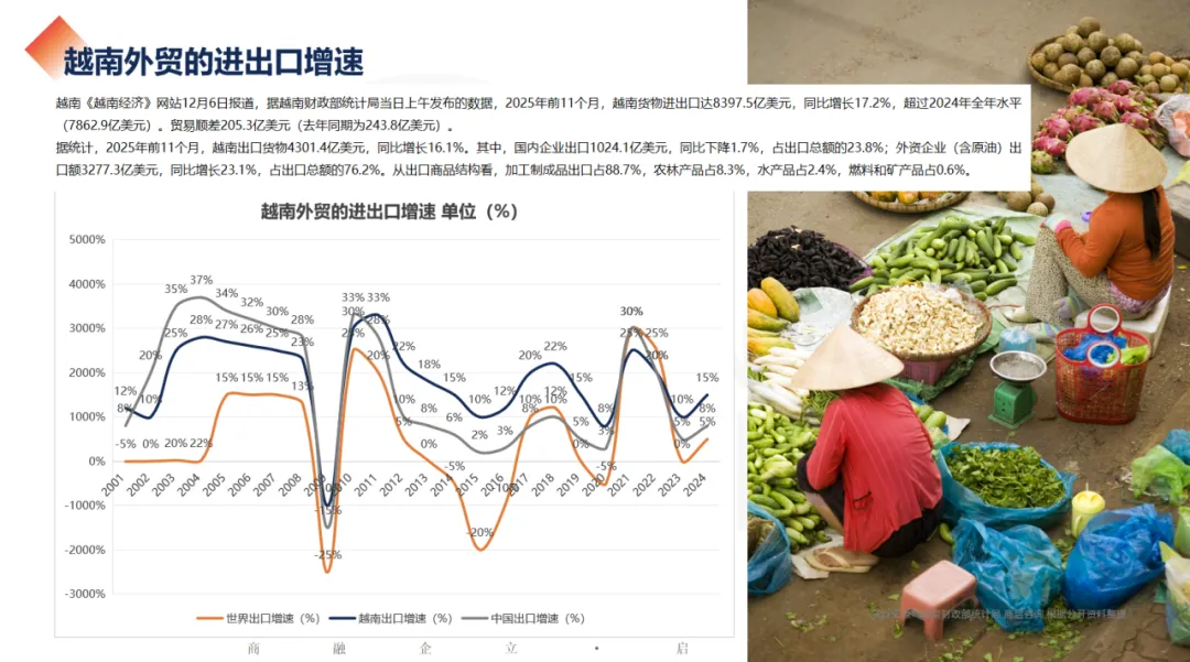 近年来,越南经济展现出强劲的转型活力与增长韧性:作为出口导向型经济体,其出口产业结构在过去十年间完成关键升级,从纺织、制鞋等传统劳动密集型领域,逐步向电子、半导体等技术密集型产业倾斜,为经济高质量发展筑牢根基。