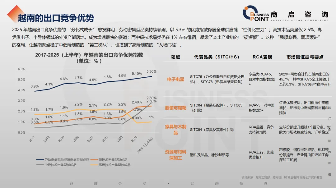 2025 年越南出口竞争优势的 “分化式成长” 愈发鲜明:劳动密集型品类持续领跑,以 5.3% 的优势指数稳居全球供应链 “性价比主力”;高技术品类虽仅 2.5%,却凭借电子、半导体领域的外资产能落地,成为增速最快的赛道;而中级技术品类仍在 1% 左右徘徊,暴露了本土产业链的 “硬短板”。这种 “强项愈强、弱项缓进” 的格局,让越南既坐稳了中低端制造的 “第二梯队”,也摸到了高端制造的 “入场门槛”。