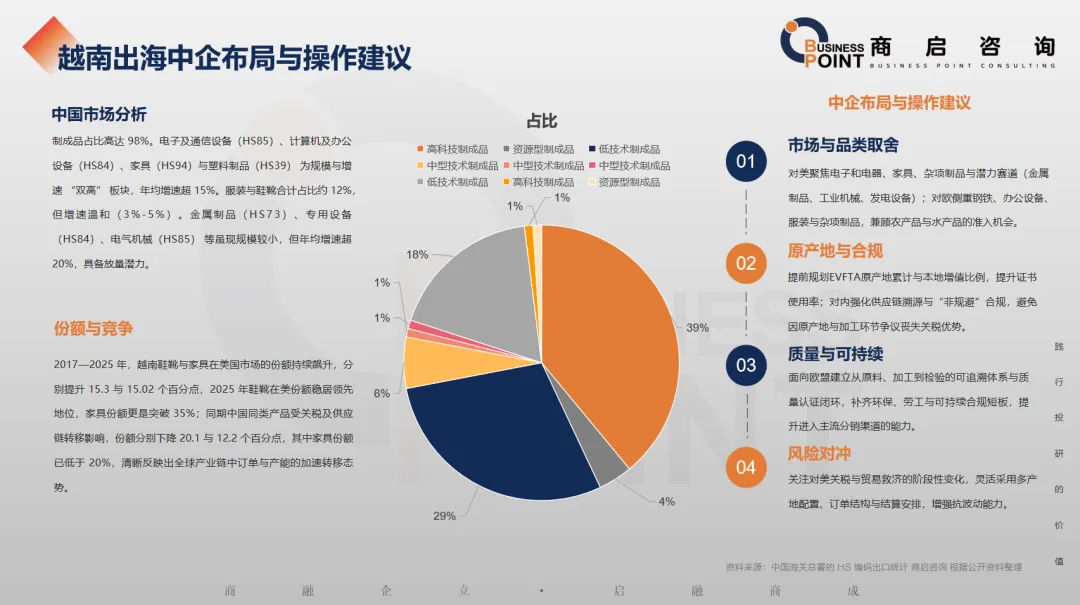 中国市场分析制成品占比高达 98%。电子及通信设备(HS85)、计算机及办公设备(HS84)、家具(HS94)与塑料制品(HS39) 为规模与增速 “双高” 板块,年均增速超 15%。服装与鞋靴合计占比约 12%,但增速温和(3%-5%)。金属制品(HS73)、专用设备(HS84)、电气机械(HS85) 等虽现规模较小,但年均增速超 20%,具备放量潜力。份额与竞争2017—2025 年,越南鞋靴与家具在美国市场的份额持续飙升,分别提升 15.3 与 15.02 个百分点,2025 年鞋靴在美份额稳居领先地位,家具份额更是突破 35%;同期中国同类产品受关税及供应链转移影响,份额分别下降 20.1 与 12.2 个百分点,其中家具份额已低于 20%,清晰反映出全球产业链中订单与产能的加速转移态势。