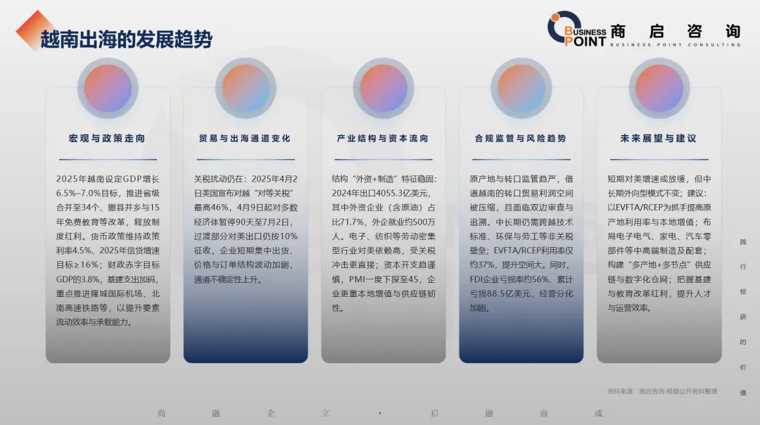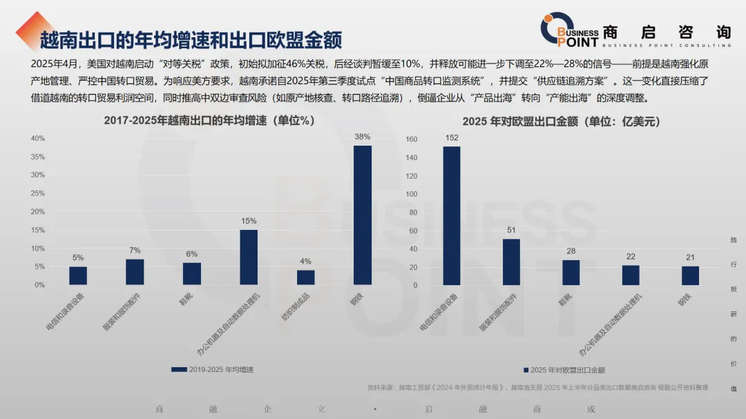 2025年4月,美国对越南启动“对等关税”政策,初始拟加征46%关税,后经谈判暂缓至10%,并释放可能进一步下调至22%—28%的信号——前提是越南强化原产地管理、严控中国转口贸易。为响应美方要求,越南承诺自2025年第三季度试点“中国商品转口监测系统”,并提交“供应链追溯方案”。这一变化直接压缩了借道越南的转口贸易利润空间,同时推高中双边审查风险(如原产地核查、转口路径追溯),倒逼企业从“产品出海”转向“产能出海”的深度调整。