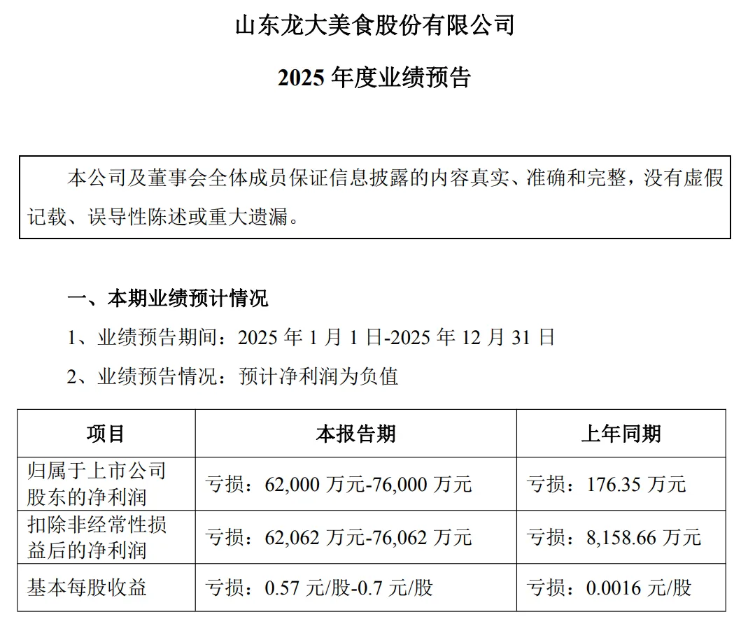 ------广告------1月30日晚间,龙大美食(002726)密集发布公告。其中,在2025年度业绩预告中,预计2025年度归母净利润亏损6.2亿元至7.6亿元,上年同期亏损176.35万元。报告期内,受行业周期影响,毛猪销售价格及猪肉市场价格持续低位运行,公司传统业务板块出现较大亏损,同时,公司按照企业会计准则的相关规定对存货及生物资产计提了减值准备。
