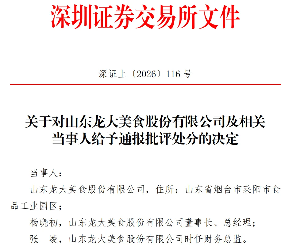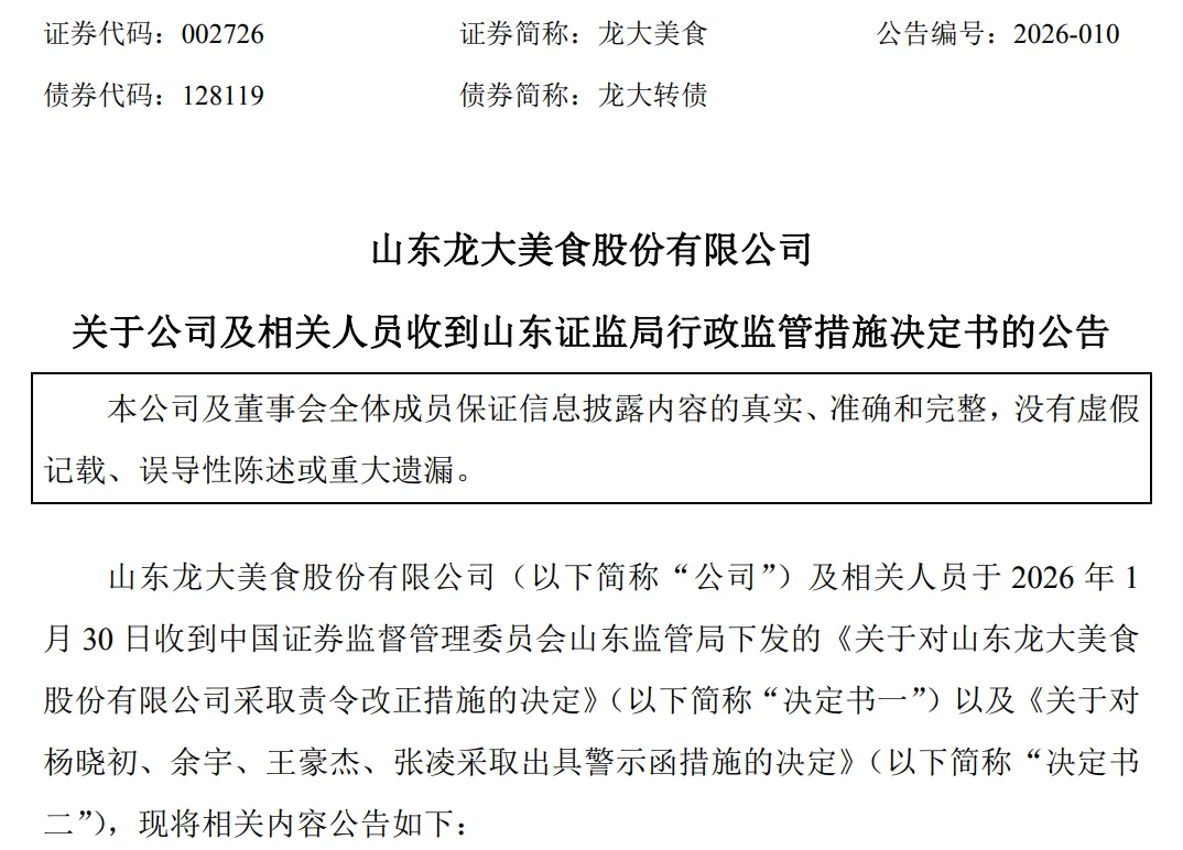 龙大美食当天还公告称,公司及相关人员于2026年1月30日收到山东证监局下发的《关于对山东龙大美食股份有限公司采取责令改正措施的决定》以及《关于对杨晓初、余宇、王豪杰、张凌采取出具警示函措施的决定》。
