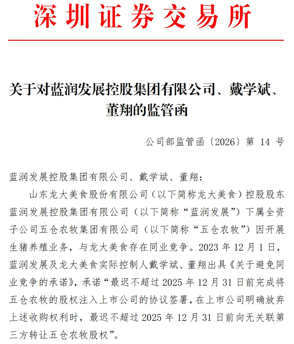 根据监管函,龙大美食控股股东蓝润发展下属全资子公司五仓农牧因开展生猪养殖业务,与龙大美食存在同业竞争。2023年12月1日,蓝润发展及龙大美食实际控制人戴学斌、董翔出具《关于避免同业竞争的承诺》,承诺“最迟不超过2025年12月31日前完成将五仓农牧的股权注入上市公司的协议签署,在上市公司明确放弃上述收购权利时,最迟不超过2025年12月31日前向无关联第三方转让五仓农牧股权”。