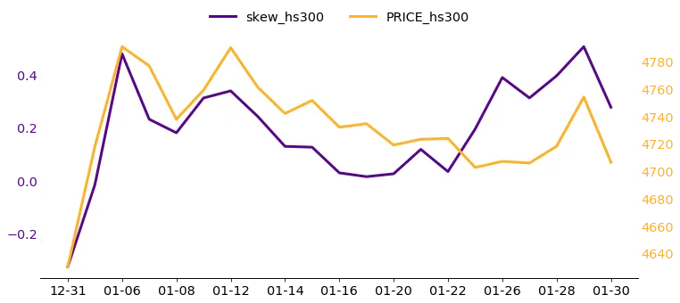 图3和4中,指数走势:走势与沪深300基本一致,表现为先扬后抑。月初触及阶段性高点后承压调整,月中波动较大,月末呈现小幅反弹回升;VIX指数:全月波动频繁,整体呈现“两头高、中间低”的格局;SKEW指数:全月在正值区间内剧烈波动,其起伏节奏与波动率指数保持强相关 。