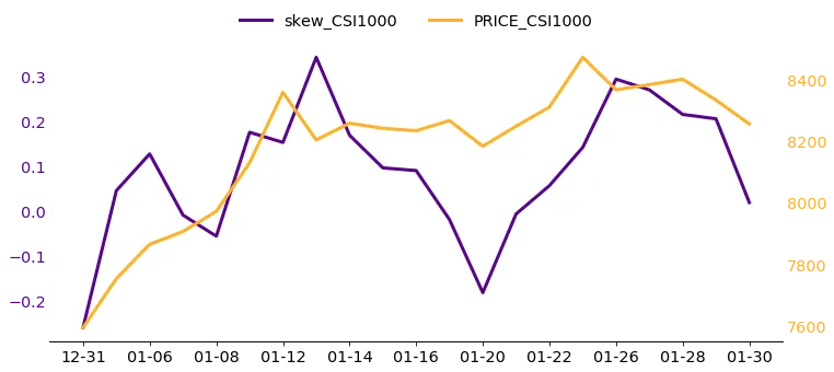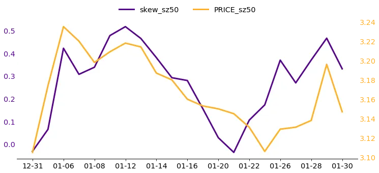 图6和7中,指数走势:走势明显强于大盘股,全月呈现稳健的震荡上行态势,展现出较强的小盘股上涨韧性 ;VIX指数:波动率虽在绝对水平上高于大盘股,但节奏上保持一致,经历了月初冲高、月中回落、月末再度拉升的过程;SKEW指数:走势与波动率指数及标的指数均保持正向共振,月初从低位反弹后全月维持震荡态势,月末受市场情绪带动小幅回落 。