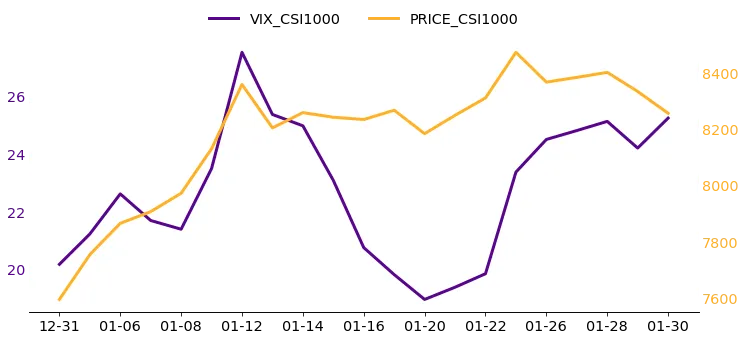 中证1000 VIX指数,衡量的是期权市场投资者对中证1000未来30天波动率的预期。指数计算方法结合CBOE方法与中国期权市场特色,具体参见附注。