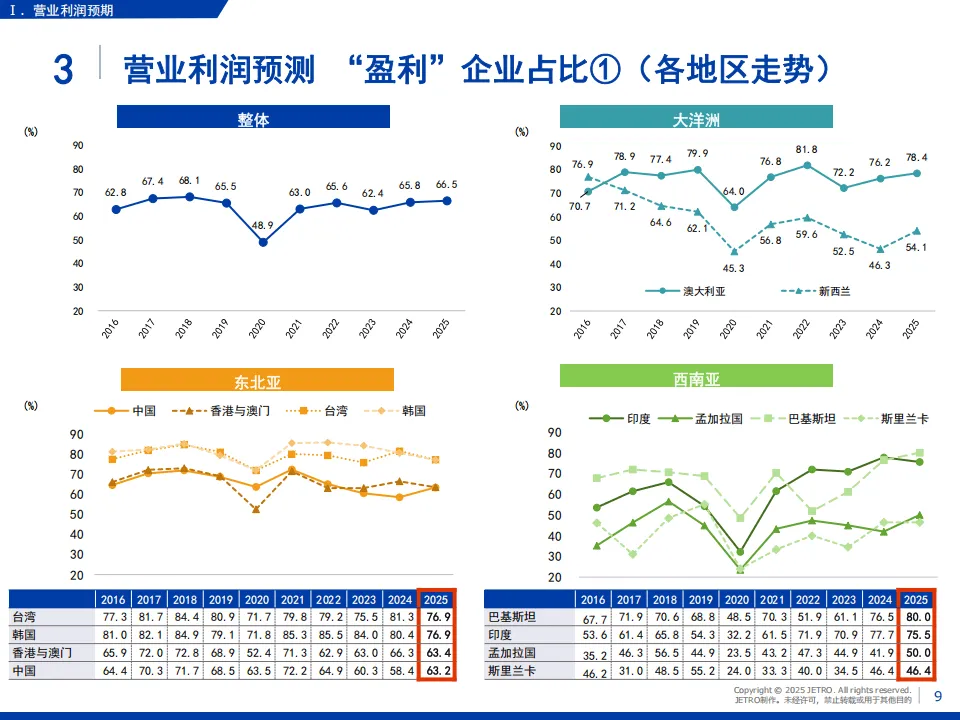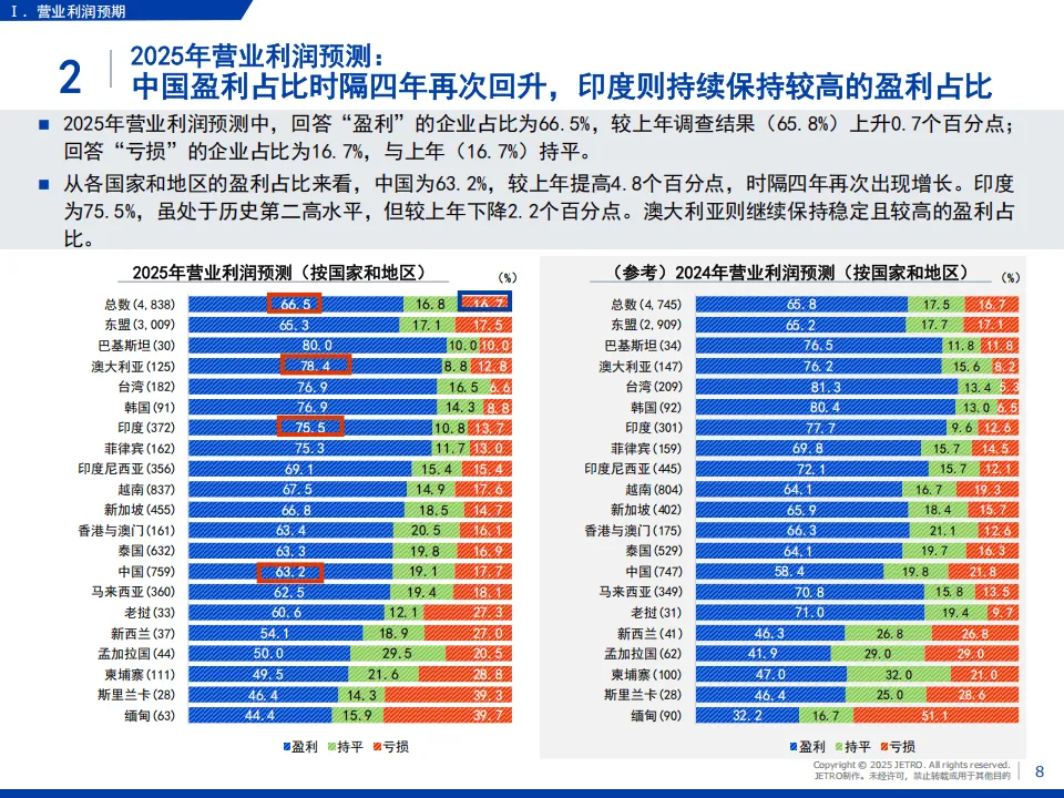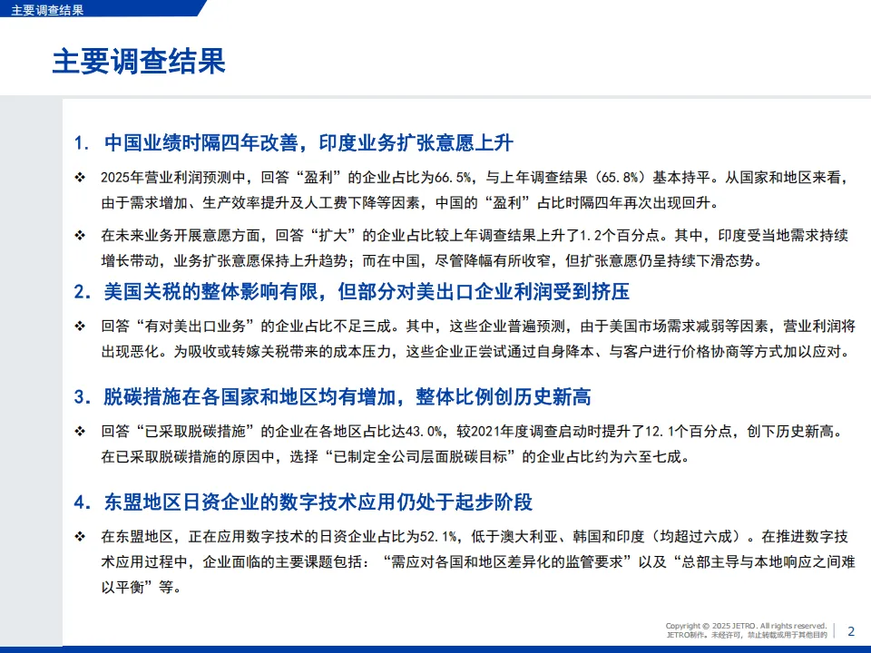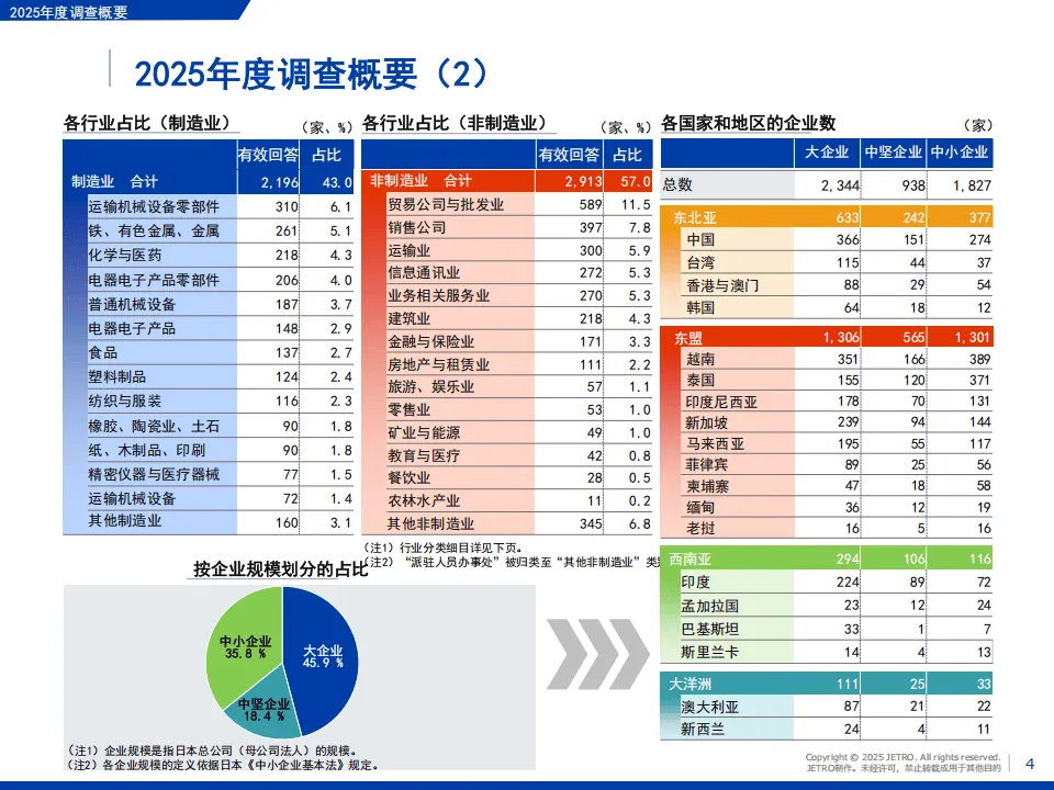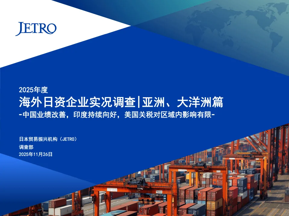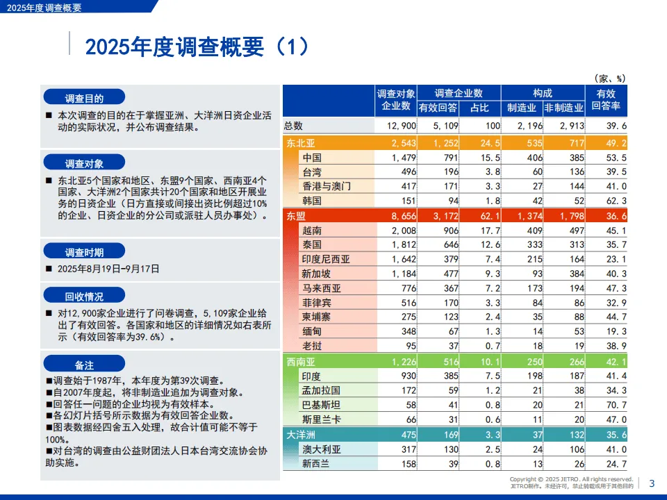 日本贸易振兴机构(JETRO)2025年度海外日资企业实况调查覆盖亚洲、大洋洲20个国家和地区,回收5109家企业有效问卷,核心呈现了日资企业在区域内的经营现状与发展趋势。
