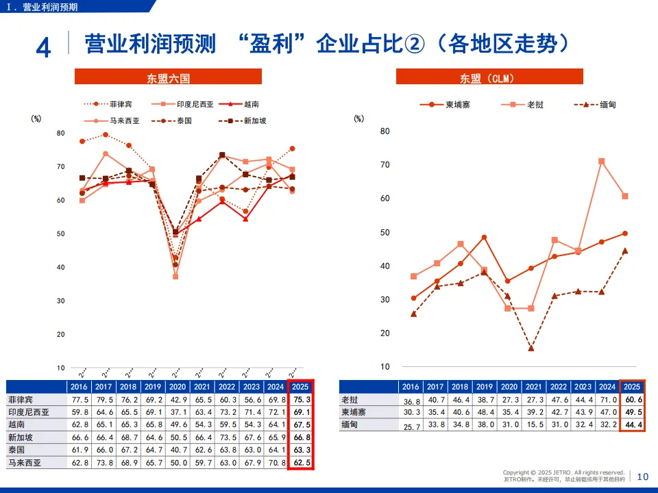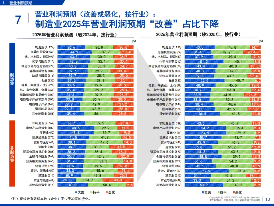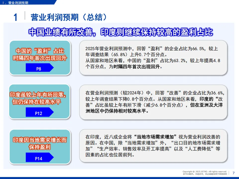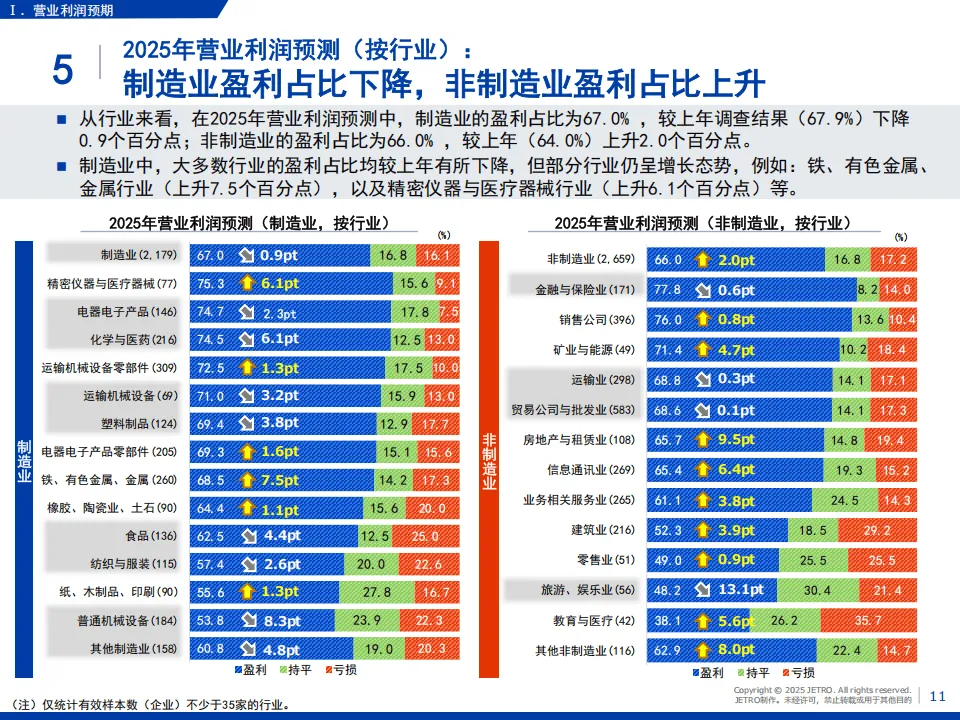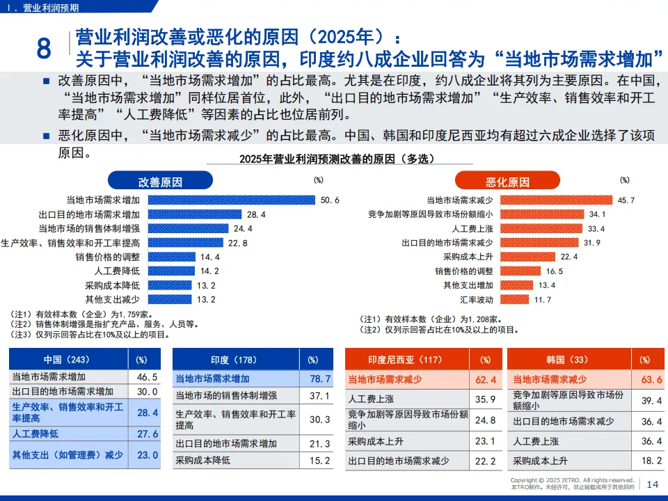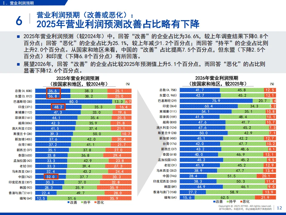 日本贸易振兴机构(JETRO)2025年度海外日资企业实况调查覆盖亚洲、大洋洲20个国家和地区,回收5109家企业有效问卷,核心呈现了日资企业在区域内的经营现状与发展趋势。
