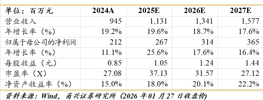 公司深耕精密电子组装和半导体封装领域。我们预计公司2025-2027年归母净利润2.67/3.14/3.65亿元,按1月27日收盘价,对应EPS 1.05/1.24/1.44元,对应PE37.13/31.57/27.12倍,我们认为,公司有望受益于AI发展带动的设备需求增加及半导体设备国产替代加速,业绩增长有望加速,上调评级,给予“买入”评级。
