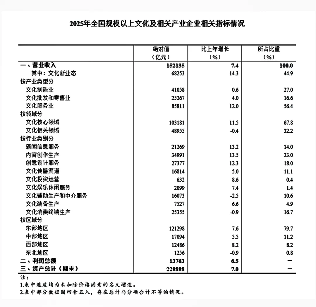 深度分析:这一数据标志着文化产业营收规模实现万亿级增量(较上年增加 10451 亿元),在全球经济放缓、国内需求收缩的背景下,7.4% 的增速显著高于多数传统制造业,充分展现抗周期韧性。更关键的是,新业态成为增长核心引擎 —— 其对整体营收增长的贡献率高达 81.6%,直接拉动增长 6.0 个百分点,印证了《关于推进文化产业数字化转型的指导意见》等政策推动下,数字技术与文化产业融合的显著成效。从具体细分领域看,娱乐用智能无人飞行器制造、数字出版等 8 个新业态小类均实现两位数增长,构成了产业增长的 "主力军"。