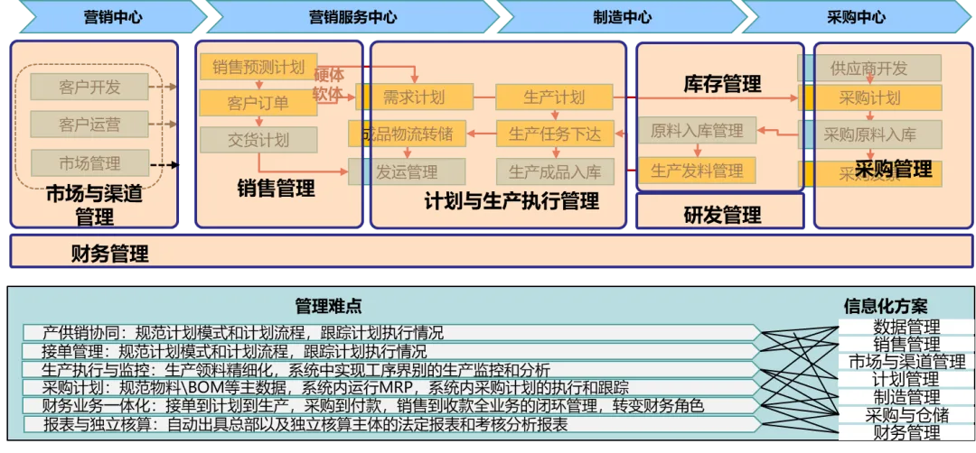 业务环节痛点:营销端计划流程不统一,经销商渠道管理缺乏系统支撑,促销返利政策执行效率低、易出错;生产端执行粗放,物料需求计划依赖手工计算,生产领料与订单无法精准对应,成本归集颗粒度粗;供应链端采购过程难以跟踪,原材料仓储分属不同账套,成品账实不符常见;财务端业务数据与财务数据无法实时同步,报表出具依赖人工汇总,成本核算不准确。