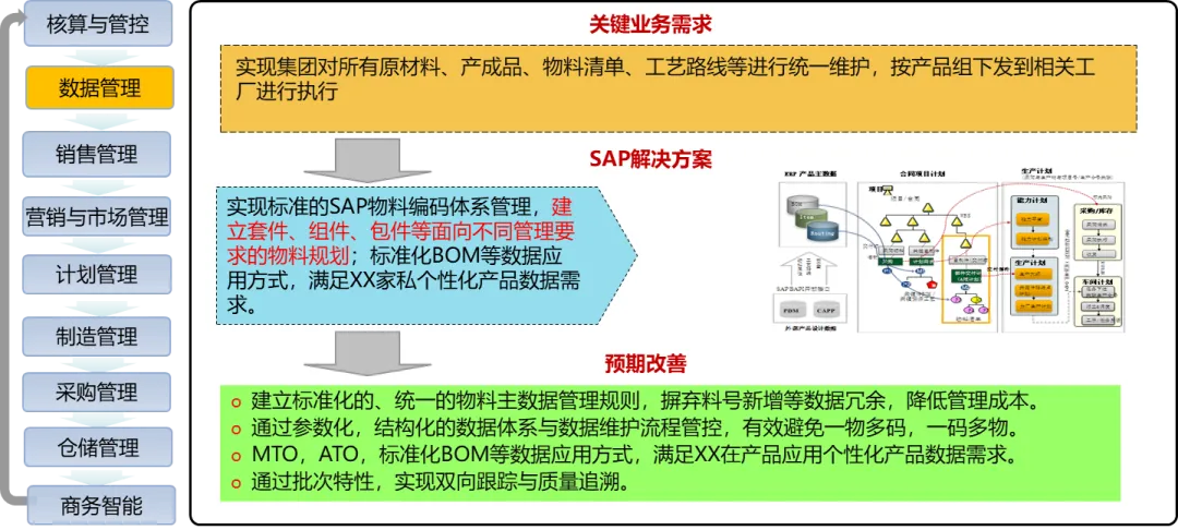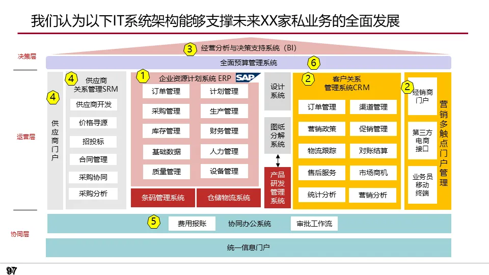 解决方案以 SAP 为核心,构建覆盖 “决策层 — 运营层 — 协同层” 的全价值链数字化平台,整合 ERP、CRM、SRM、MES、BI 等系统,形成 “数据统一、流程贯通、业务集成、智能管控” 的一体化架构。实施策略遵循 “总体规划、分步实施” 原则,通过三期建设逐步实现流程贯通、战略支撑与决策支持的递进目标。