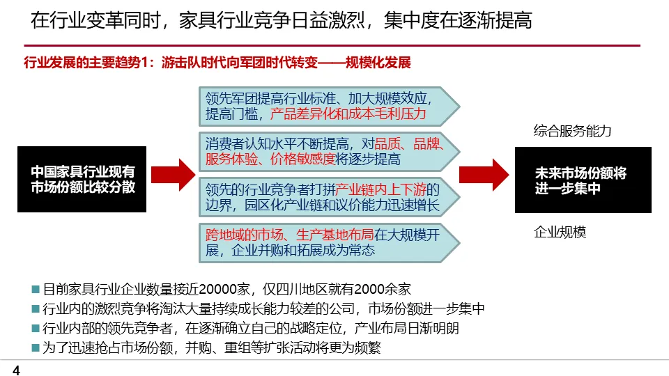 当前家具行业正经历两大核心变革:一是从 “游击队时代” 向 “军团时代” 的规模化转型,市场份额加速集中,跨地域布局、并购重组成为常态,行业竞争聚焦产品差异化与成本毛利管控;二是从单一产品供应向综合服务供应的集成化发展,消费者对品质、品牌、服务体验的要求持续提升,倒逼企业强化全价值链能力。